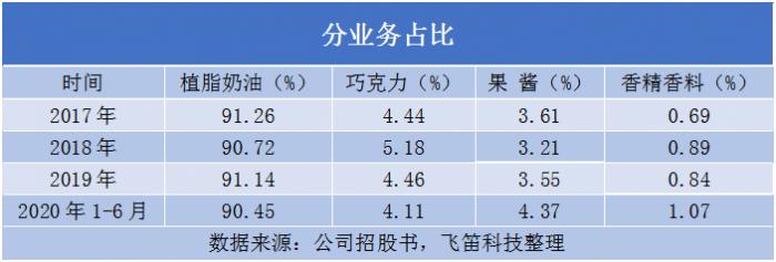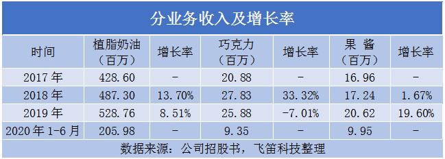 植脂奶油是公司的主要产品,报告期内,分别实现收入4.29亿元、4.87亿元、5.29亿元和2.06亿元,整体呈增长的趋势,但2019年的增速较2018年有所下滑,使得公司整体营收增速相应下滑。