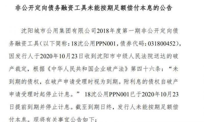 截图称,因发行人于2020年10月23日收到沈阳市中级法院送达的破产裁定,根据破产法46条规定,“未到期的债权,在破产申请受理时视为到期,附利息的债权自破产申请之日起停止计息。”18沈公用PPN001已于2020年10月23日提前到期并停止计息。截至到期日终,发行人未能按期足额偿付本息。