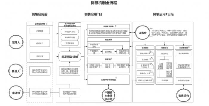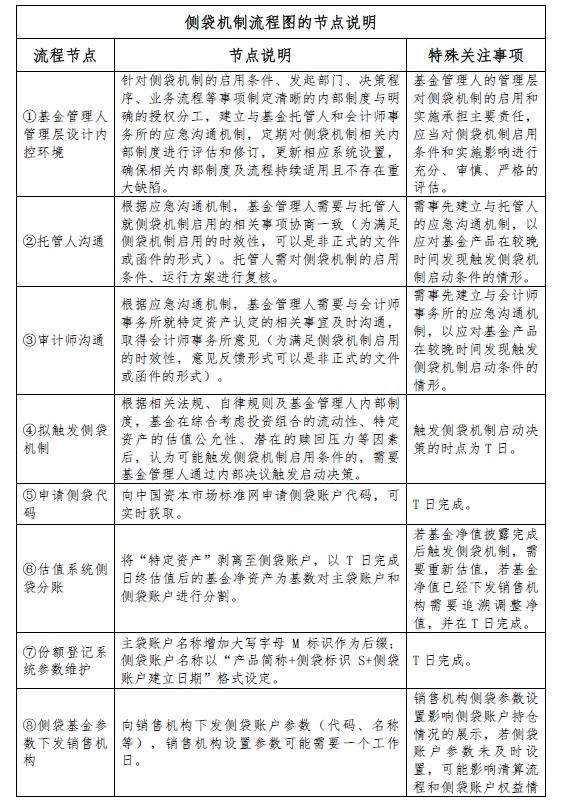 《侧袋操作细则》分为八章共二十六条,从侧袋机制启动、实施及资产处置三个阶段,对基金启用情形和相关操作、启用时的份额申赎、款项支付、分红和费用收取等方面进行了细化,并同时明确了侧袋机制的估值核算、份额登记、信息披露等具体化要求。