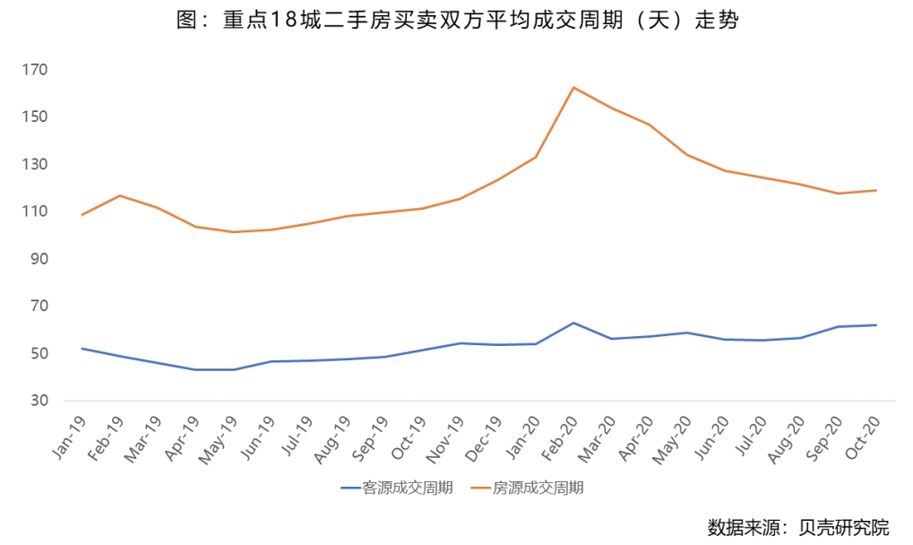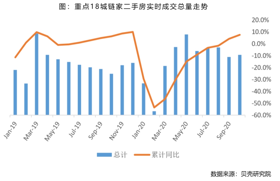 成交环比持平、同比大增,市场处2017年以来中温状态。贝壳研究院数据显示,10月重点18城[1]链家二手房实际成交环比增加3.6%,基本持平。疫后需求释放步入疲软期,近两月月均成交较4-8月降15%。不同于去年10月重点城市二手房市场普遍处偏冷状态,今年疫情延后需求释放,叠加货币宽松购房信贷环境改善,10月18城二手房成交总量处2017年以来月度较高水平,同比增加46%,带动前10月累计成交同比增幅扩大至7.4%。