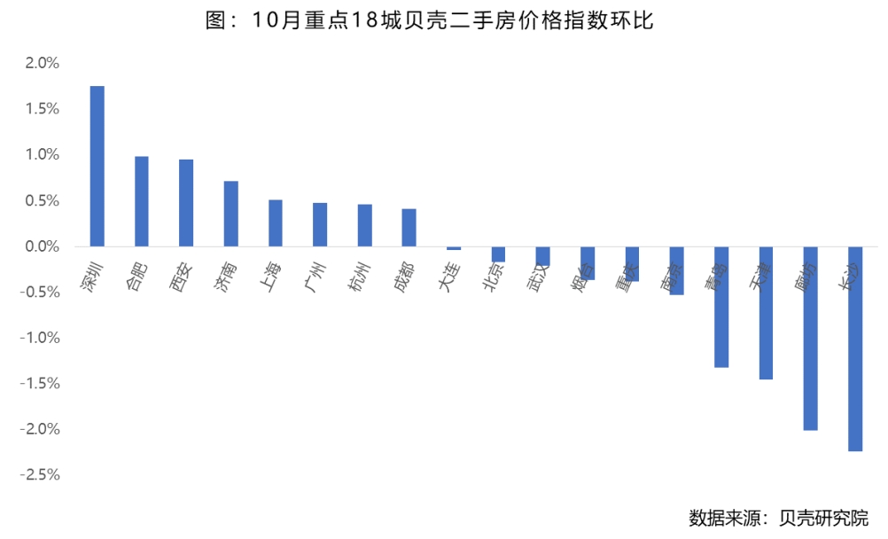 10月价格上涨的城市涨幅温和,且涨幅在1%以上的城市数量由6个降至3个,其中深圳价格环比涨幅略有扩大,为1.8%。近日深圳先行示范区综合改革实施方案出台一定程度上对市场信心有所提振,业主预期较为坚挺。上海、广州两城价涨收窄,10月环比上涨0.5%。