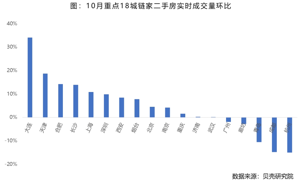 2、城市间市场有所分化。环渤海的大连、天津10月成交环比分别增长34%和19%。珠三角的深圳、东莞市场低位修复,但与政策前水平比仍腰斩。杭州、成都两城在前期调控作用持续发酵下,成交环比降15%。