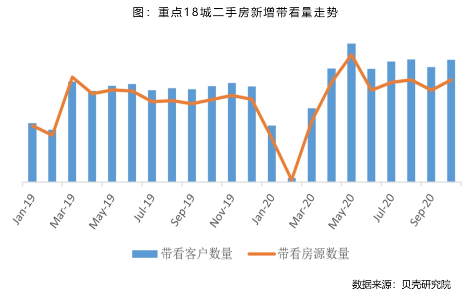 1、10月市场稳字当头。重点18城二手住宅成交量环比增幅不足4%。近两月重点城市二手房市场步入需求释放疲软期,月均成交较此前5个月降15%。但疫情延后需求释放,10月成交水平不低,处在2017年以来月度较高位上,同比大幅增加46%。