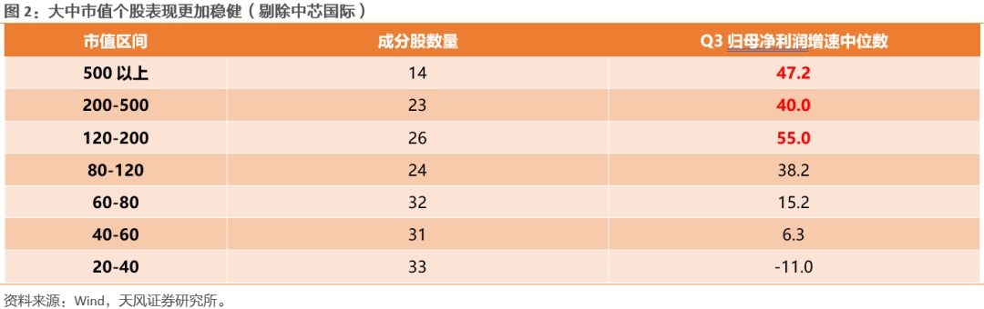 从市值结构来看,大中市值个股业绩增速更稳健,与小市值个股分化严重。我们按照市值大小将个股分为7组并计算其业绩增速中位数,我们可以看到大中市值个股表现更加稳健,特别是市值在120亿以上的个股;而小市值个股业绩普遍不佳,其中40亿以下市值的个股甚至业绩增速中位数为负。