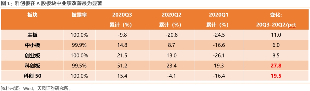 1.科创板业绩增速表现强劲,是A股所有板块中改善最为显著的。截至10月30日,除中芯国际以外,科创板业绩已经全部披露完毕。从披露业绩来看,科创板整体延续了此前业绩改善的趋势且相比于A股其他主要板块,科创板保持更高的业绩增速和更显著的改善趋势。