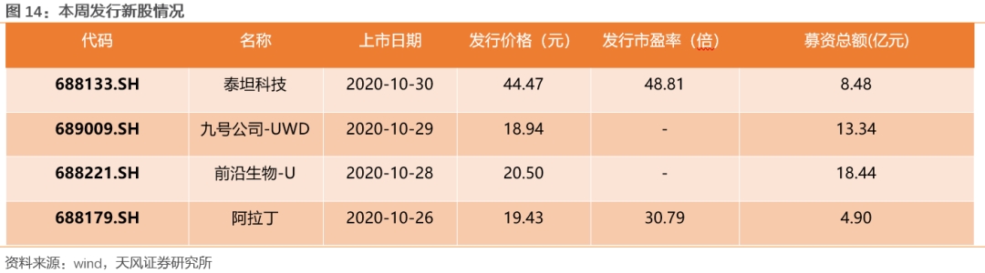 3.蚂蚁集团在10月29日完成网上和往下申购,预计可能在11月上旬上市,蚂蚁集团将成为A股募集资金最大的公司。根据蚂蚁集团公告,10月29日蚂蚁集团完成网上和往下申购。我们梳理此前科创板上市个股缴款日与最终上市日的时间间隔,平均为8.9天,这也意味着,蚂蚁集团大概率会在11月上旬登陆科创板。按照68.8元/股预计募集资金金额为1149.45亿元,如果超额配售选择权行使,那么预计募集资金总额将达到1321.86亿元,而这也将超越农业银行成为募集资金最多的上市公司。