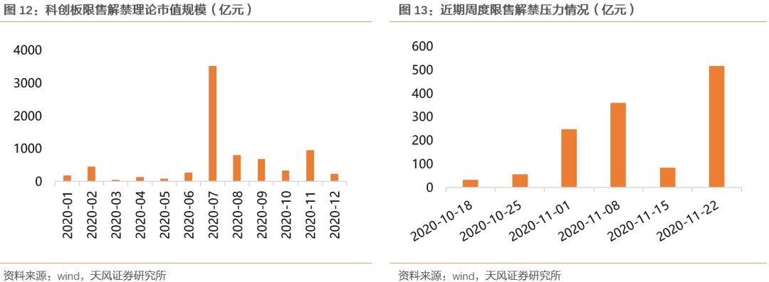 限售解禁方面,下周科创板限售解禁压力略微上升,11月限售解禁的压力提高。本周限售解禁规模理论市值为248.03亿元,下周限售解禁规模理论市值上升至359.76亿元,资金流出压力稍增。与此同时,从月度维度来看,整个11月限售解禁规模共计962.21亿元,为近几个月中解禁压力较大的。