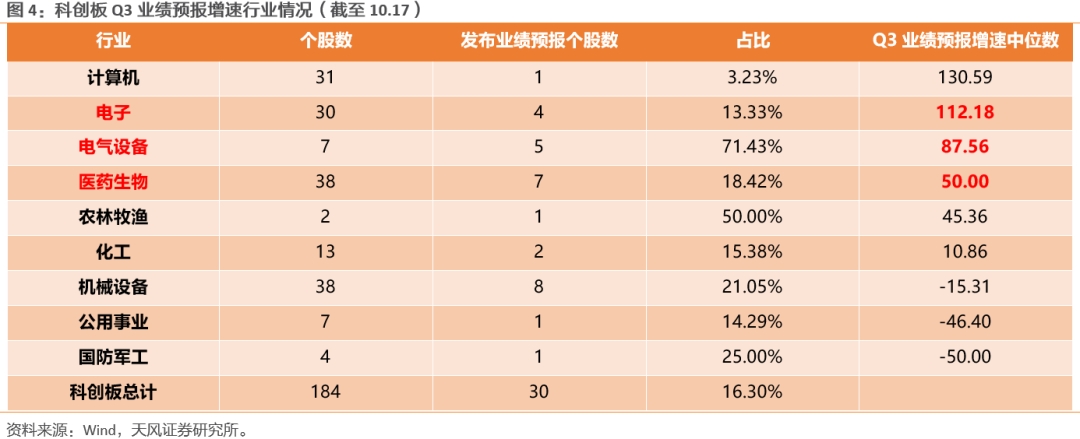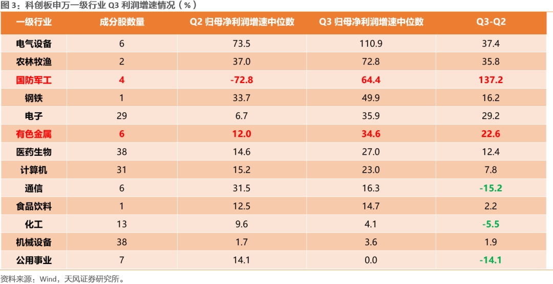 我们在报告《科创板三季报预报有哪些信息?》中提到,根据预报情况来看,披露率较高的电气设备、医药生物、电子预计景气度较高;而从资金表现来看,股价表现与业绩增速高低具有一定的正相关性,这也表明,在中报落地后,资金开始进入到三季报布局期,资金更青睐业绩增速好的板块。其中,在Q3业绩显著改善的板块中,有色金属、国防军工行业由于预报信息较少,此前受到资金关注可能不高,可能会演绎预期修正的行情,建议重点关注。