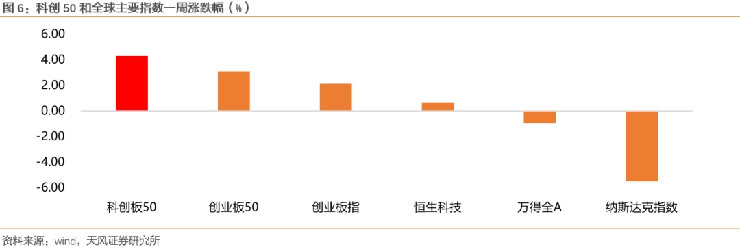 科创50本周表现相对强势。本周科创50指数整体表现强势,在全球的主要指数当中,科创50指数以4.29%的涨幅位列第一。而从个股表现来看,除了CDR新上市的九号公司以外,机械设备、电子、计算机等存量个股表现也较为突出。