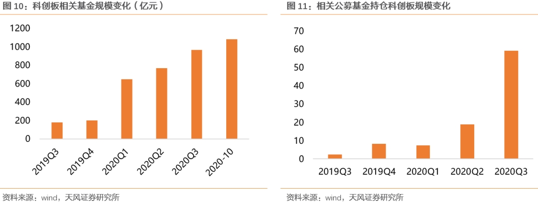 长线投资资金规模持续走高。涉及科创板投资的公募基金共有83只,而从基金规模变化来看,在科创板开板一年多以来,相关基金的投资规模从2019Q3的179亿增长到今年十月的1085亿。而从相关基金持股科创板的个股市值来看,从2019Q3的2.5亿升至2020Q3的59.2亿,上升了近24倍,这也表明相关基金持续加仓科创板,长期资金投资的热情高涨。