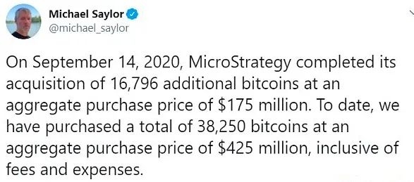 8月,MicroStrategy称其购买了2.5亿美元比特币,9月份,该公司CEO表示MicroStrategy又投资了比特币1.75亿美元。