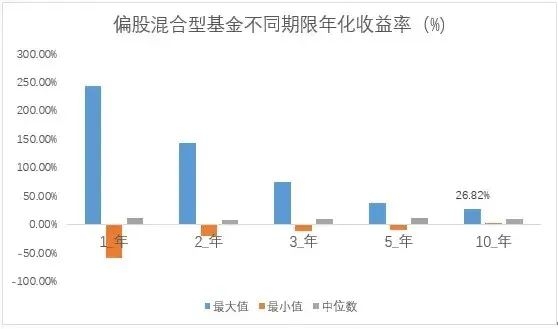 以偏股混合型基金为例,持有1年时间最高收益可以达到240%,同时,亏损最大也可能达50%。(数据来源:Wind,2005.1.1-2020.8.18)面对这市场的波动起伏,不少投资者早早离场。其实,随着持有时间的拉长,年化收益的上下限都在缩小,如果持有10年的话,年化最高时可以达到26.82%,最低的时候年化收益下限也有2.84%。