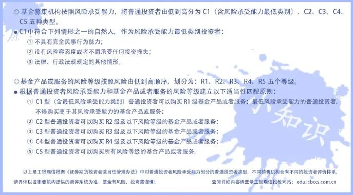 投资前,投资者应了解自身的风险偏好,做好承担相应风险的心理准备。了解自己的风险承受能力,是C1、C2、C3......了解后,投资者应结合自身风险承担能力进行选择相应风险等级的产品。