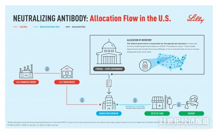 在具体的分发上,礼来称联邦政府会负责适当分配bamlanivimab。每周的分配决定将根据每个州和地区过去七天内确诊的新冠肺炎病例比例,并根据美国卫生与公众服务部(Department of Health and Human Services)“保护数据收集平台”(Protect data collection platform)提供的数据。每个星期,州和地区的卫生部门将选择医疗场所接受分配的剂量,并将向AmerisourceBergen提供医疗场所清单。护理中心将确认他们的需要,AmerisourceBergen将在夜间分发bamlanivimab。