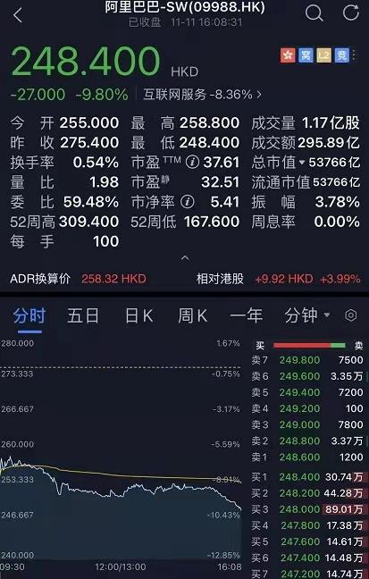 阿里巴巴,港股在10月27日录得319港元的新高,现已回落至248.4港元,10日大跌超5%,11日更狠,暴跌近10%,两天跌去了14%。