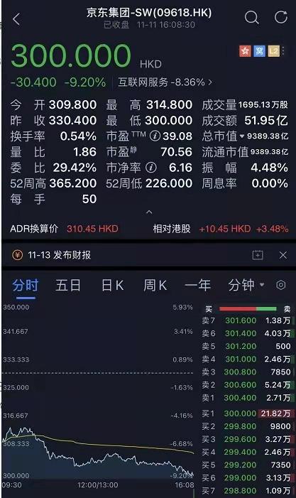 而京东集团在11月9日探至365.2港元的新高,现股价300港元,10日跌去8.78%,11日跌去9.20%,两天合计跌去超17%!