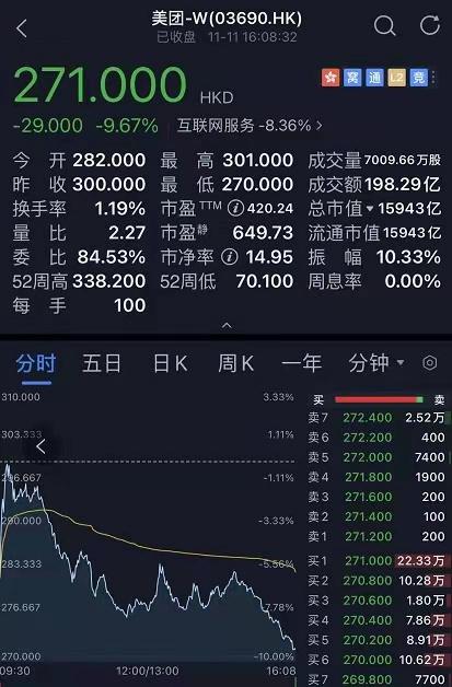 而美团在11月9日股价盘中高达338港元,总市值盘中一度超工商银行,现股价已跌回271港元,这两天一共跌去了近20%!