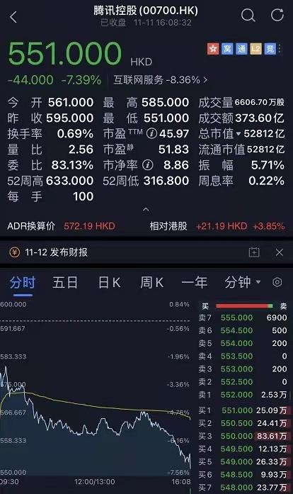 而腾讯在11月9日触及633港元的高位,现已回落至551港元,这两天跌去了11%。
