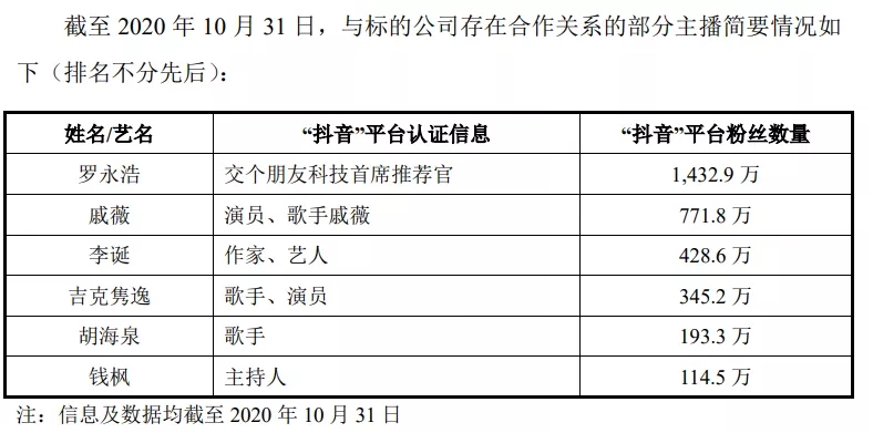 从业务范畴看,星空野望于2020年10月起陆续与戚薇、李诞、吉克隽逸、胡海泉、钱枫等艺人主播建立合作关系。上述艺人时而出现在罗永浩直播间中,与老罗同台带货。但显然,相关艺人的出场以客串为主,与全职带货的罗永浩有本质差异。整个公司的营收增长潜力,仍然依赖罗永浩及其团队的带货能力。