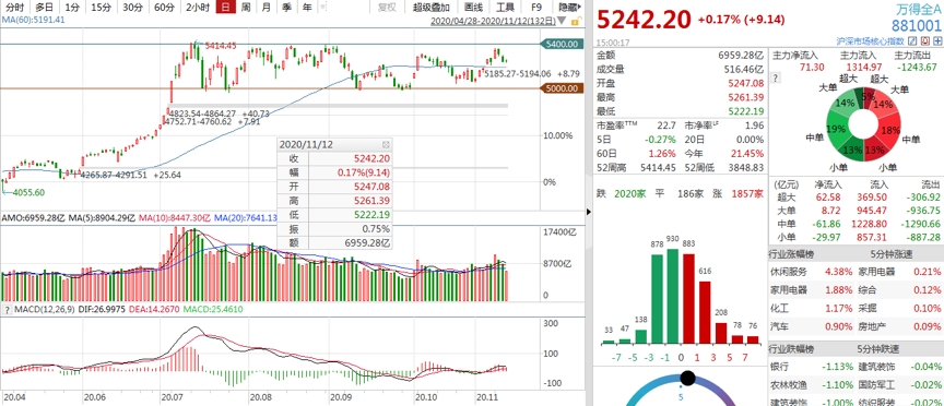 11月12日市场缩量震荡,上午市场不温不火,接近11点左右证券板块突然出现直线拉升,陆港通北向资金也出现大幅净流入,但未能带动人气,各指数小幅冲高后快速回落。下午市场继续维持震荡,最终上证综指下跌0.11%,沪深300上涨0.07%,中证500上涨0.33%。行业方面休闲服务、家电、化工涨幅居前,银行、农林牧渔、建筑装饰跌幅居前。全市场成交额大幅缩量,略超过7000万元。