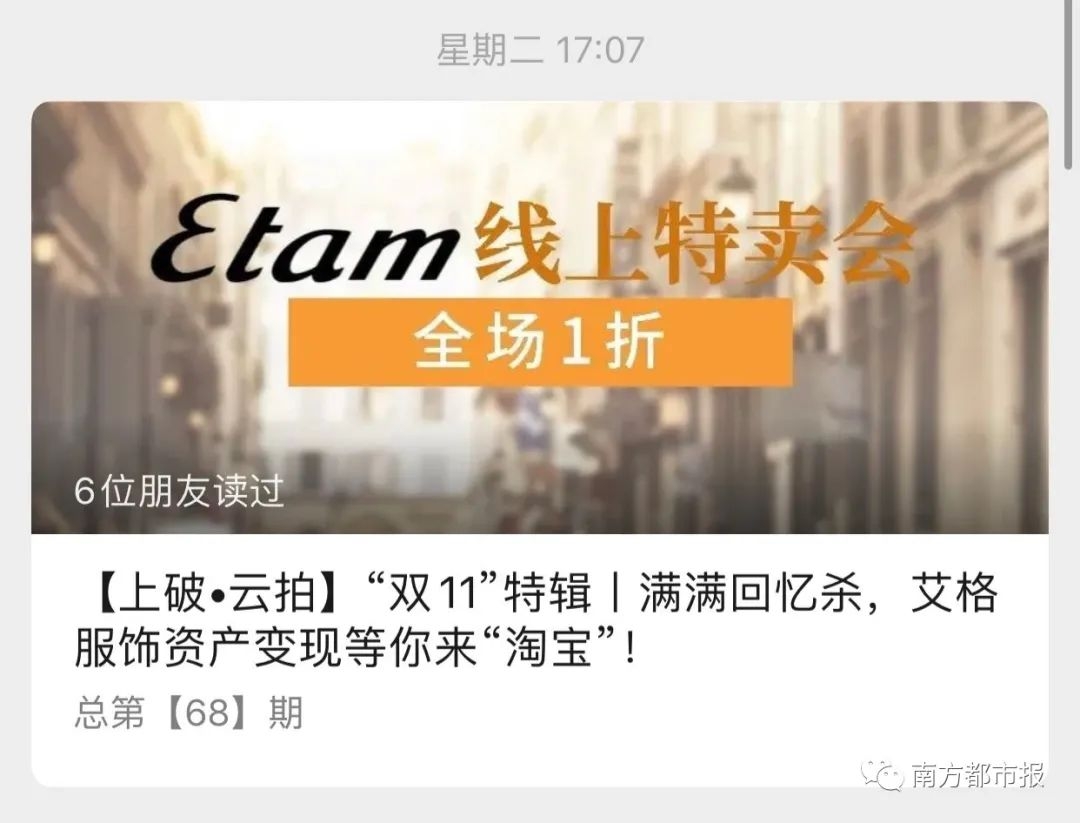 在“双十一”到来前一天(11月10日),上海破产法庭公众号发布一则“双11”特辑消息,提及上海艾格服饰有限公司(以下简称“艾格公司”)破产清算案,将在网店以“全场一折”的特价处置资产。