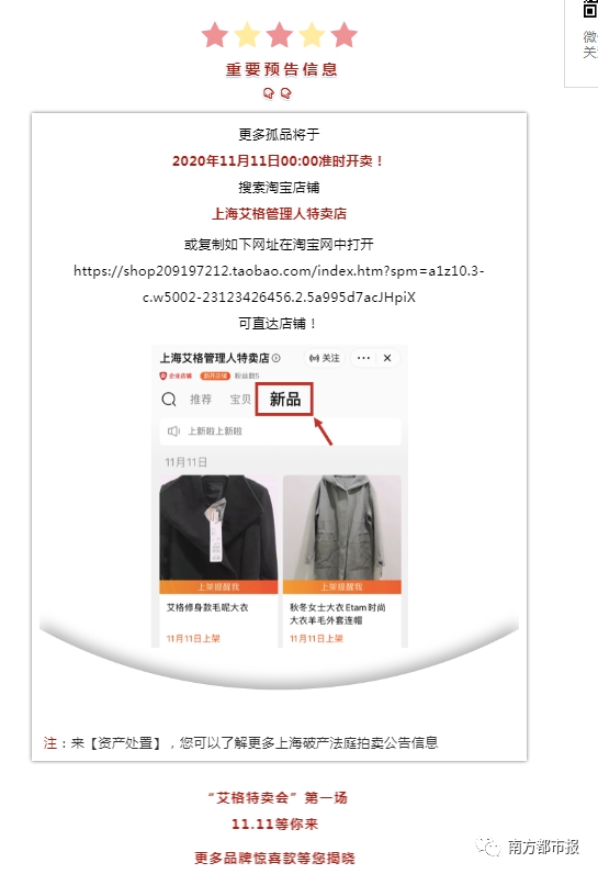 为充分保障全体债权人的利益,在合议庭的指导下,管理人在双十一首次尝试在淘宝网平台开店卖货。据悉,此次所甩卖的艾格服装,主要来自于其遍布全国各地商场库存量极大的门店。