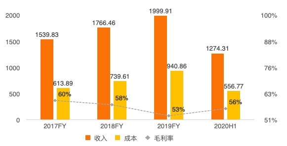 对于用户不可或缺的游戏和社交网络服务(下文简称“增值服务”),是腾讯主要收入来源。根据财报,腾讯超过一半的收入来自增值服务,而后者超过一半的收入来自游戏。腾讯的增值服务在2017年、2018年、2019年和2020年上半年的收入分别为1539.83亿元、1766.46亿元、1999.91亿元和1274.31亿元,毛利率分别为60.13%、58.13%、52.95%和56.31%(见图1)。尽管手机游戏和数字内容为腾讯带来了较快的收入增长,但内容成本增加、智能手机渠道以及分销渠道成本的增加,毛利率有了下降的趋势。