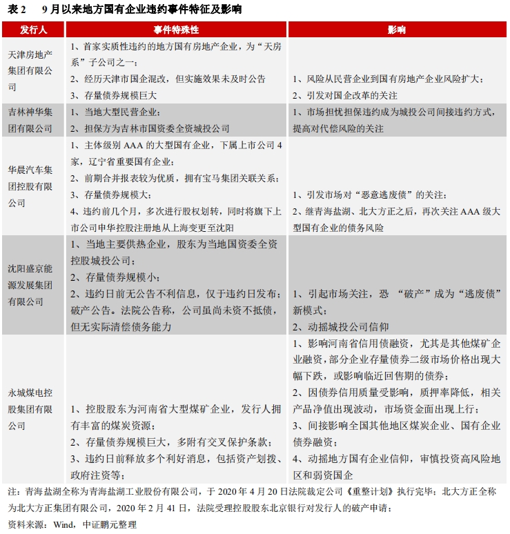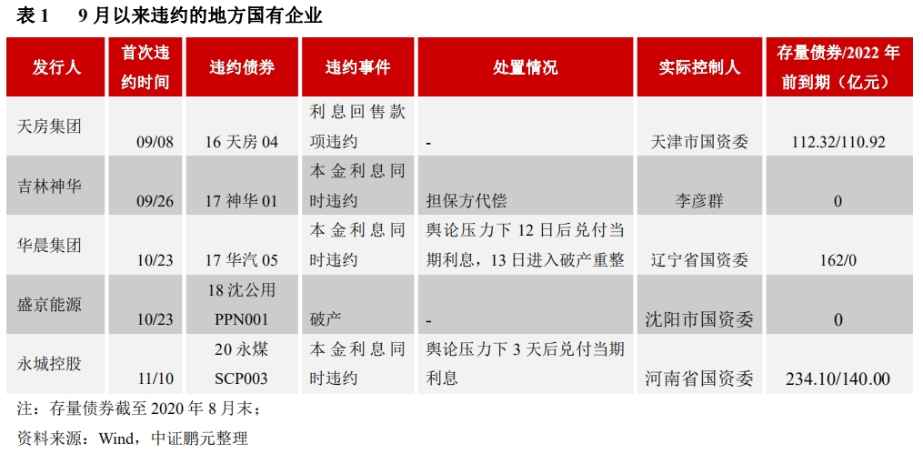 2020年9月以来,债券市场出现了几次地方国有企业的违约事件,严重动摇了市场的信心,主要包括两种类型,一是,实际控制人为当地国资委,资产负债和存量债券规模巨大,是当地主要发债主体,违约时有“黑云压城城欲摧”的架势,包括天津房地产集团有限公司(简称“天房集团”)、华晨汽车集团控股有限公司(简称“华晨集团”)、永城煤电控股集团有限公司(简称“永城控股”);二是,当地大型民营企业,其债券的担保人为当地国有企业,例如,吉林神华集团有限公司(简称“吉林神华”);三是,地方重要国有企业的子公司,业务以准公益性和经营性业务为主,具有重组价值,例如,沈阳盛京能源发展集团有限公司(简称“盛京能源”)。