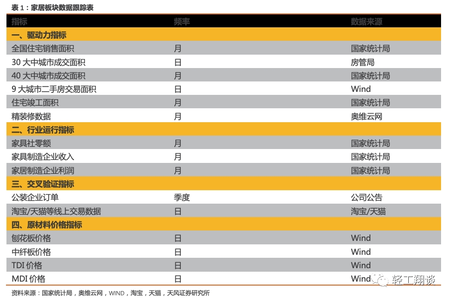 天风轻工家居板块大数据跟踪报告对于影响家居板块基本面的主要数据情况做详细的梳理和解读。我们数据体系由四个部分构成,分别是行业驱动力指标、行业运行指标、上下游交叉验证指标、原材料价格指标,数据涵盖范围广,除了统计局数据,还使用了线上交易数据、房管局二手房数据、价格数据、上下游企业数据等等。