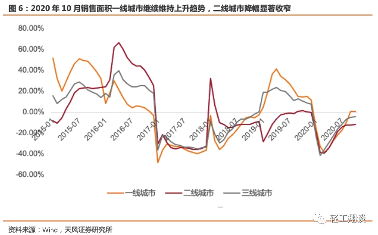 分线数据来看,2020年10月一线城市商品房成交面积255.32万平方米,同比上升3.43%。累计看,2020年1-10月一线城市商品房成交面积2790.55万方,累计同比上升0.92%,继续维持上升趋势。