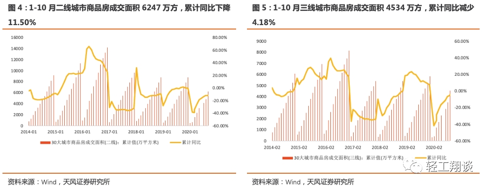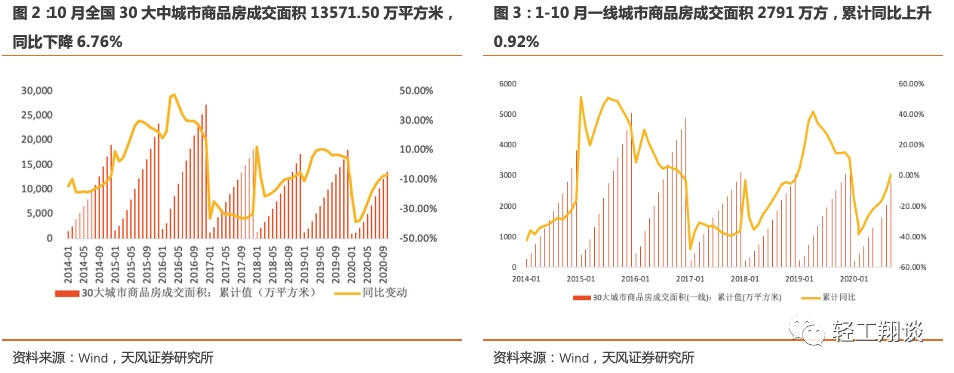 全国一、二线及重点三线城市单10月新房销量较上月略有下滑, 1-10月累计值全国30大中城市、一线、二线、三线城市商品房住宅成交面积依旧受到一季度拖累为负增长。整体上看,2020年1-10月全国30大中城市商品房成交面积13571.50万平方米,同比下降6.76%,降幅比前9月收窄0.49pct;分单月看,2020年单10月全国30大中城市商品房成交面积1425万平方米,同比下滑2.36%,涨幅较9月下降13.13pct,单月成交势头放缓。