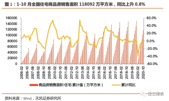2020年1-10月全国住宅商品房销售面积118092万平方米,同比上升0.8%,累计同比增速回正,涨幅比1-9月上升1.8pct。单月数据看,全国住宅商品房销售面积14478万平方米,同比上涨16.0%,单月销售显著改善,同比提升11.6pct。