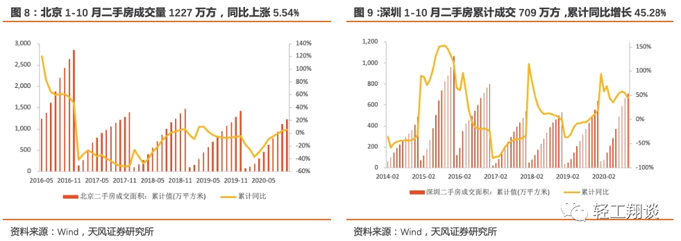 一线城市中,北京二手房成交量在2019年6月以来持续回暖,短期由于新冠肺炎疫情冲击,2020年1-10月北京市二手房成交量1227万方,同比上涨5.54%,自九月以来持续上涨。深圳自2019年4月开始累计增速下滑速度已逐步趋缓,10月累计增速已转正,2019年12月累计同比增长20.09%,2020年以来深圳楼市出现显著回暖,叠加低基数影响,1-10月深圳二手房累计成交709万方,累计同比增长45.28%。