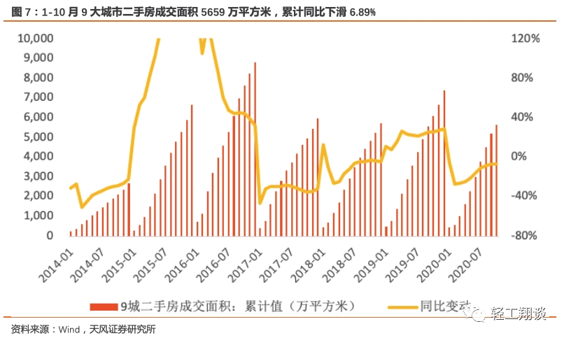 我们选取了9个一二线城市作为样本(包括2个一线城市,7个二线城市), 2020年10月9大城市二手房成交面积464万平方米,同比减少11.97%,降幅较9月单月增加19.31pct。累计看,2020年1-10月9大城市二手房成交面积5659万平方米,累计同比下滑6.89%,降幅较前9月增加0.48pct。