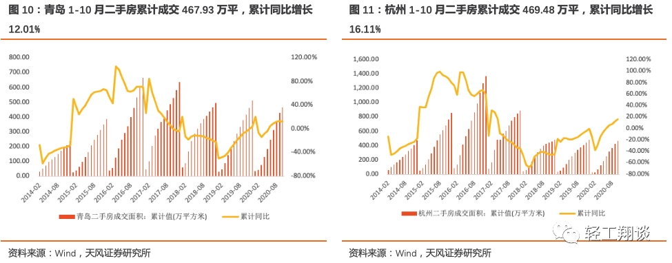 二线城市二手房成交方面,从我们统计的7个城市2020年1-10月二手房成交面积数据显示,成都、厦门、苏州3个城市前10月二手房成交累计同比均有下滑,厦门2020年1-10月累计同比下降6.67%,成都2020年1-10月累计同比下降54.18%,苏州2020年1-10月累计同比下降42.61%;青岛2019年累计同比增长8.45%,2020 年1-10月累计同比增长12.01%。杭州1-10月累计同比增长16.11%,较前9月增幅扩大3.78pct。南京2020年1-10月累计同比上升29.42%。