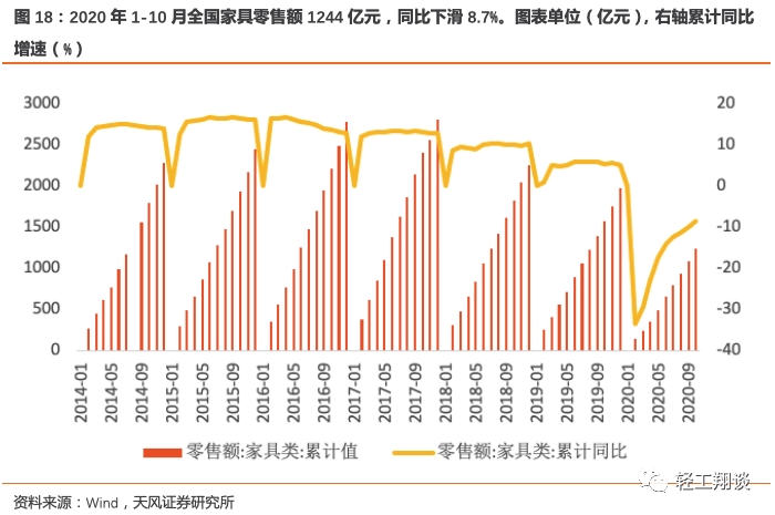 全国家具零售额10月单月157亿元,同比上涨1.3%,家居零售单月保持稳定。2020年1-10月全国家具零售额1244亿元,同比下滑8.7%,降幅较1-9月收窄1.2pct。