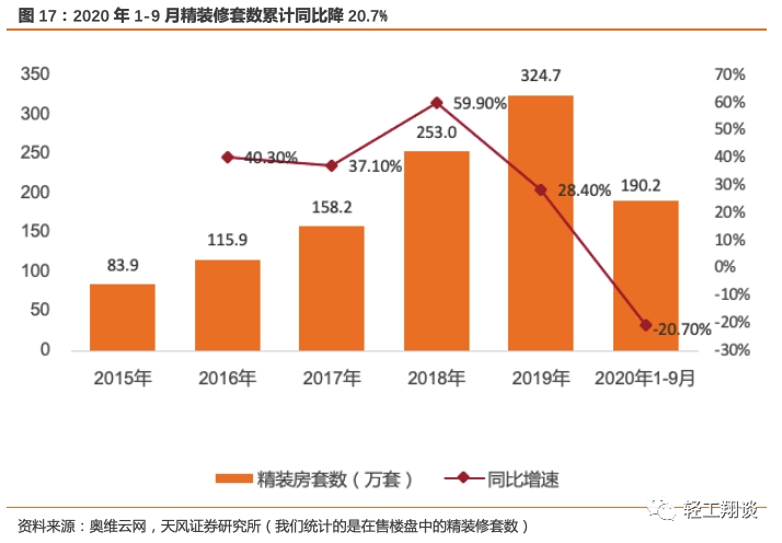 受复工延后新开工下行,1-9月精装开盘情况同比增速有较大幅度下滑但在逐渐收紧。2020年1-9月全国精装修商品房开盘量合计190.2万套,同比下降20.7%。16-18年精装修开盘量有大幅增长,建设周期在2-3年,故2020-2021年为精装修房提供材料供应的企业收入预计仍会有较快增长。