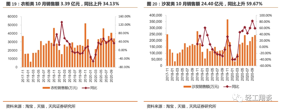 沙发类10月销售额24.40亿元,同比上升59.67%,2020年1-10月累计销售额163.12亿元,累计同比上升35.36%;