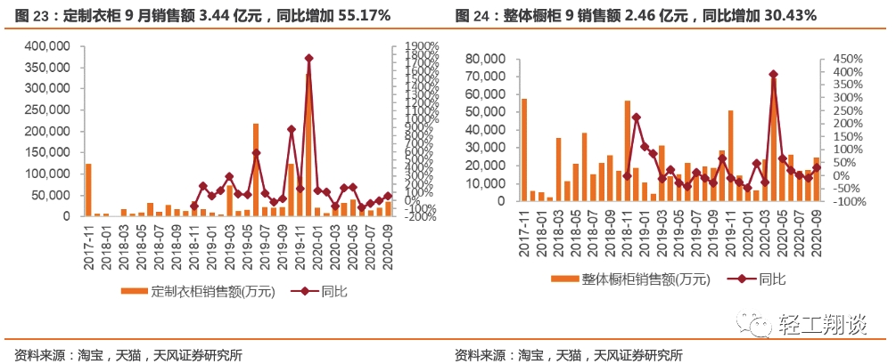 定制衣柜9月销售额3.44亿元,同比增加55.17%,2020年1-9月累计销售额22.12亿元,累计同比下降44.58%;