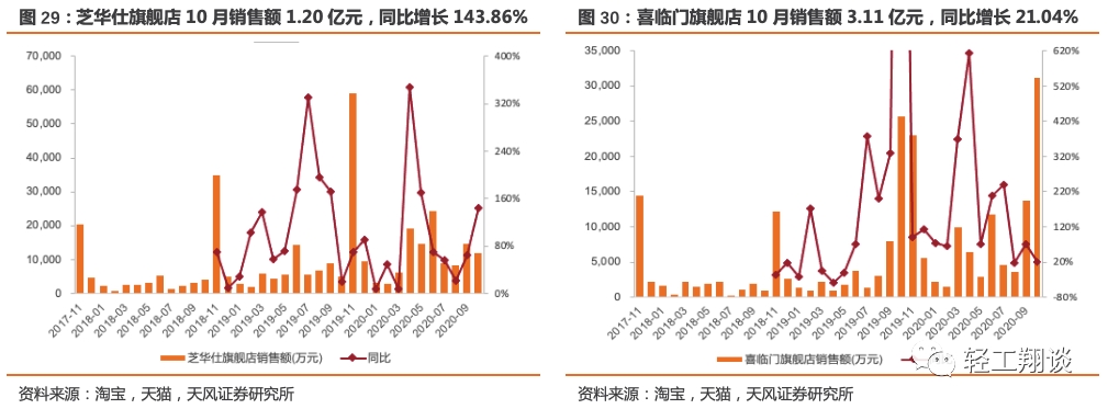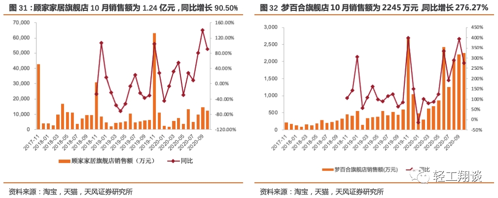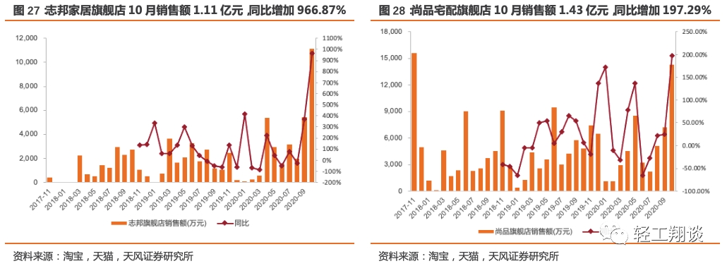 成品家居企业中,顾家家居旗舰店10月销售额为1.24亿元,同比增长90.50%,2020年1-10月累计销售额7.72亿元,累计同比增长40.96%;梦百合旗舰店10月销售额为2245万元,同比增长276.27%,2020年1-10月累计销售额23465万元,累计同比增长437.39%;喜临门旗舰店10月销售额3.11亿元,同比增长21.04%,2020年1-10月累计销售额8.79亿元,累计同比增长79.71%;沙发企业芝华仕旗舰店10月销售额1.20亿元,同比增长143.86%,2020年1-10月累计销售额11.45亿元,累计同比增长87.44%;办公椅企业永艺旗舰店10月销售额189万,环比下滑5.80%。