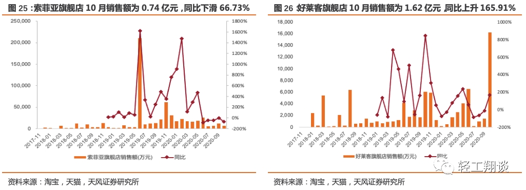 定制家居企业中,索菲亚旗舰店10月销售额为0.74亿元,同比下滑66.73%,2020年1-10月累计销售额15.25亿元,累计同比下滑46.86%;欧派官方旗舰店10月销售额为5.42亿元,同比下滑42.22%,2020年1-10月累计销售额17.40亿元,累计同比增加11.30%;好莱客旗舰店10月销售额为1.62亿元,同比上升165.91%,2020年1-10月累计销售额3.45亿元,累计同比增加60.58%;志邦家居旗舰店10月销售额1.11亿元,同比增加966.87%,2020年1-10月累计销售额3.23亿元,累计同比增加79.06%;尚品宅配旗舰店10月销售额1.43亿元,同比增加197.29%,2020年1-10月累计销售额5.02亿元,累计同比增加27.43%;维意定制10月销售额267万元,同比下滑85.39%,2020年1-10月累计销售额7770万元,累计同比下滑51.75%。