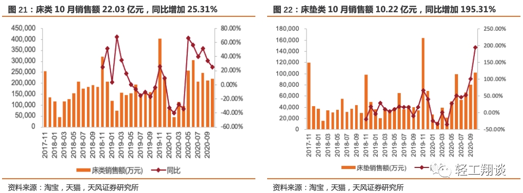 床类10月销售额22.03亿元,同比增加25.31%,2020年1-10月累计销售额178.83亿元,累计同比上升19.46%;