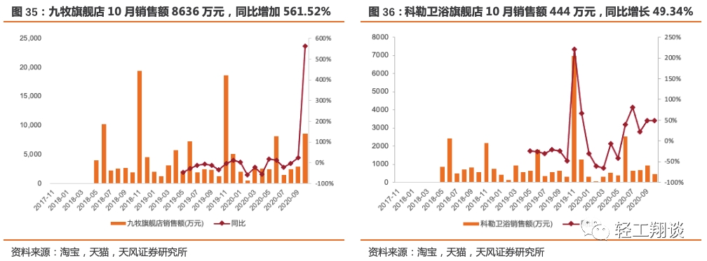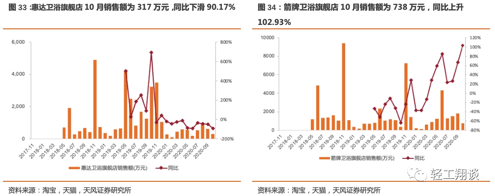 卫浴企业中,惠达卫浴旗舰店10月销售额为317万元,同比下滑90.17%,2020年1-10月累计销售额4555万元,累计同比下滑70.47%;箭牌卫浴旗舰店10月销售额为738万元,同比上升102.93%,2020年1-10月累计销售额12774万元,累计同比上升45.89%;九牧旗舰店10月销售额8636万元,同比增加561.52%,2020年1-10月累计销售额33696万元,累计同比上升14.00%;科勒卫浴旗舰店10月销售额444万元,同比增长49.34%,2020年1-10月累计销售额6766万元,累计同比上升7.08%。