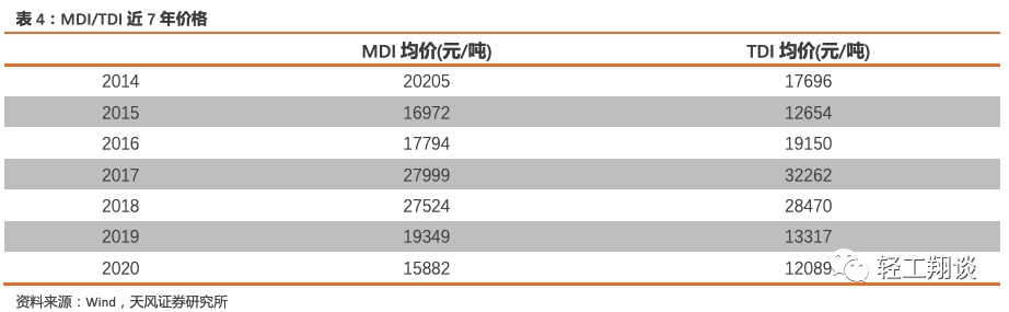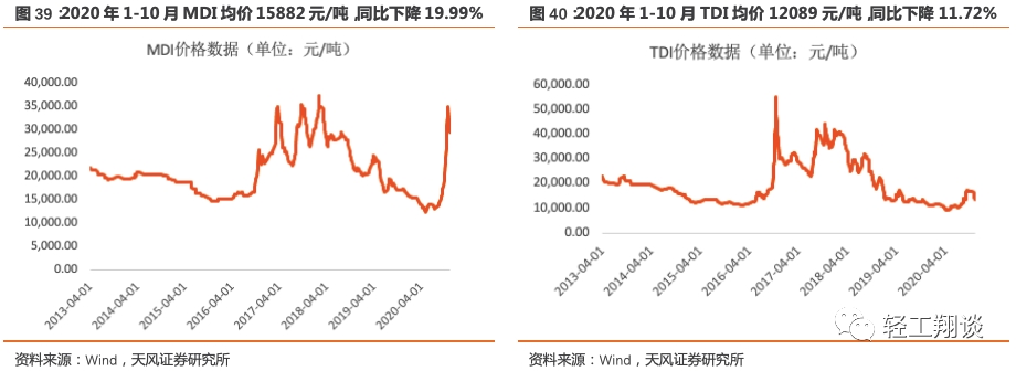 2020年1-10月TDI均价相较2019年略有下降,TDI主要用于床垫制造,2020年1-10月TDI均价12089元/吨,同比下降11.72%,10月均价16594元/吨,环比9月下降0.61%。