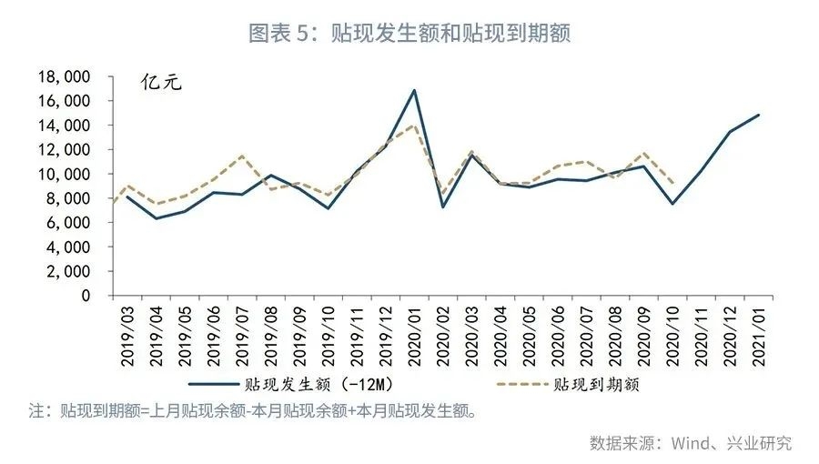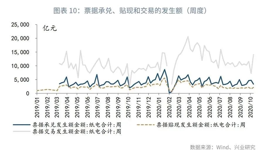 从票据贴现的发生量和到期量来看, 每年的第四季度,由于企业的现金需求较大,票据贴现发生额均较多;从历史数据来看,票据贴现发生额通常领先于票据贴现到期额1年左右(贴现到期额=上月贴现余额-本月贴现余额+本月贴现发生额,根据票交所公布的票据贴现余额和发生额,可以大致估算每个月的贴现到期额)。2019年11月、2019年12月、2020年1月,票据贴现发生额分别为了1万亿元、1.3万亿元、1.5万亿元左右,这意味着2020年11月-2021年1月,票据贴现的单月到期量可能达到万亿左右的水平。