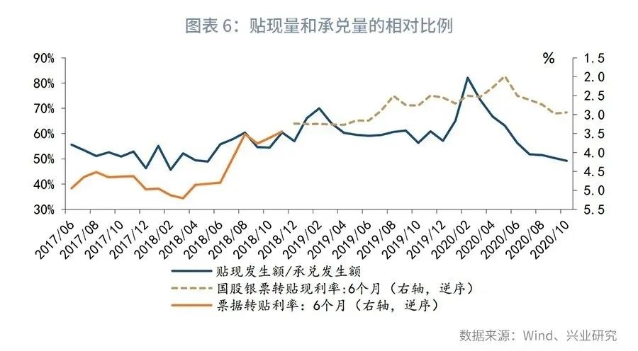 从当前票据贴现的发生量来看,2020年下半年以来,由于票据利率整体上行,企业贴现意愿不高,贴现发生量在承兑发生量中的占比不断下降。 2020年10月,单月票据贴现发生额为6684亿元,票据贴现比例(贴现发生额/承兑发生额)为49%,票据贴现发生额和贴现比例均降至2018年5月以来的最低水平。从历史数据来看,票据贴现比例和票据利率之间存在负向关系,当票据利率上行时,企业贴现成本上升,企业持有票据用于支付为主、贴现融资的比例下降。2020年以来,随着企业复工复产的加速,企业开票量在2月下旬逐步恢复,而票据贴现比例却一路下行,出现“开票热、贴现冷”的情况。在第四季度票据贴现集中到期时,贴现量不足的问题更为凸显,不过,随着近期票据利率的快速下行,企业贴现意愿有所增强,有助于缓解上述矛盾。