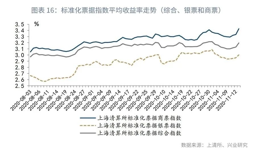 从标准化票据的发行来看, 11月上半月无新增标准化票据发行(图表18)。截至11月13日,标准化票据综合指数、银票指数和商票指数的平均收益率分别为3.20%、3.00%和3.42%,较上月末分别上升1bp、下降6bp、下降2bp(图表16);已贴现商票和未贴现商票平均收益率分别为3.22%和3.82%,已贴现商票较上月末保持不变,未贴现商票平均收益率下行9bp(图表17)。