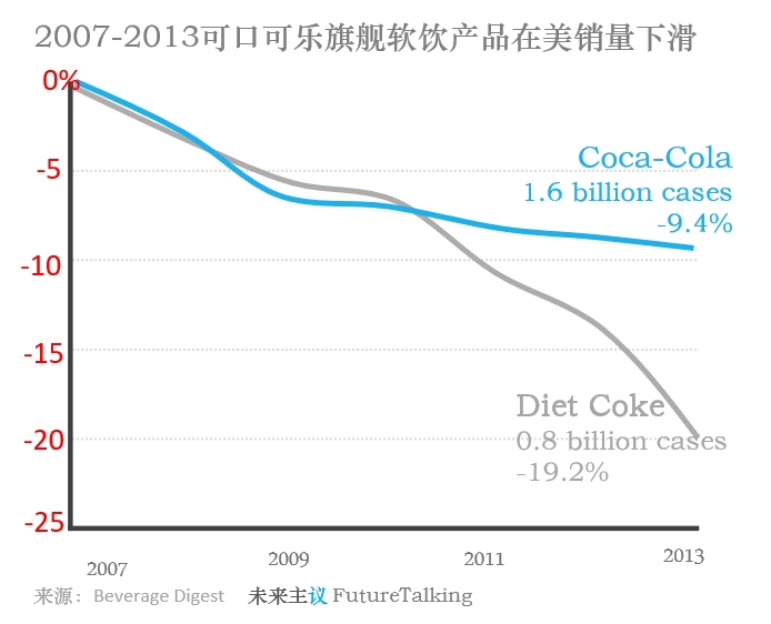 进入2004年之后碳酸饮料销量在欧美市场增长停滞,并与2007年转入跌势,而这种趋势一直持续了好几年,而Diet 似乎成了销量下降最大的拖累。2007~2013年间Diet 在美销量减少19.2%,给可口可乐公司造成了极大的业绩压力。2013年正是可口可乐备受质疑的时刻。公司股价在过去一年中下跌了2.7%,而标准普尔500指数则上涨了21%,Diet Coke销量连续下降的第8年了,似乎需要一些改变来挽救市场,创造来一些振奋人心的消息。