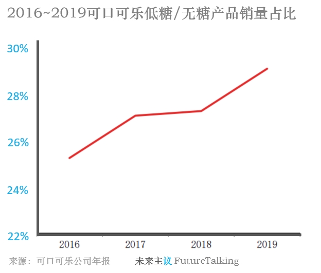 在全球性的民众减糖健康运动中,迎合某些细分人群的无糖饮品需求的策略已显得不足够,饮品减糖从迎合趋势已转变成常态化。2017~2019年可口可乐公司所进行的一系列动作充分诠释了这一转变。可口可乐公司表示遵从卫生部门提出的消费者每日从添加的糖中获得的卡路里不应超过全部卡路里的10%,这一健康指导,将减糖理念大面积地贯穿到产品改革中。不难看出,减糖已上升到全公司产品战略层面,而非某几个产品。