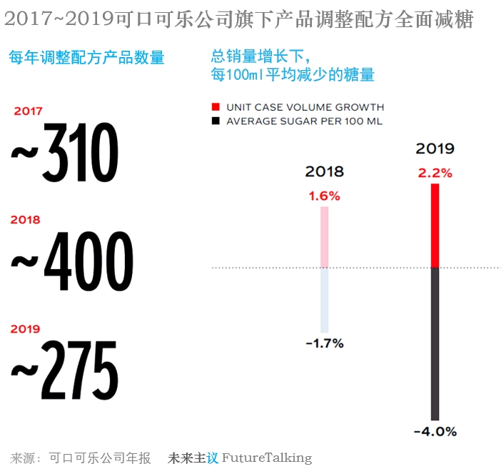 首先是产品配方的全面调整。2017~2019的三年间,可口可乐共对885款产品进行了配方调整,平均每年调整配方近300个,而在此之前的2016年可口可乐仅有80个配方进行了改变。通过改革配方,实现每年少添加35万吨糖。根据不同国家的市场环境与政策要求,可口可乐也分别制定了减糖目标。2018年可口可乐在全球1.6%的销量增长下实现减少添加1.7%的糖,2019年在全球2.2%的销量增长下实现减少添加4%的糖。